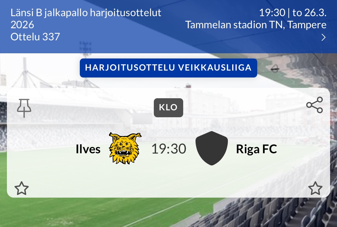 Jos jonkun niin tämän olisi toivonut vieraspeliksi. Olisi ollut hyvä syy lähteä vihdoinkin Riikaan kun muuten saan niin huonosti aikaiseksi lähteä matkalle. :D Mutta ei pidä valittaa. Hyvä testi tulossa meille.