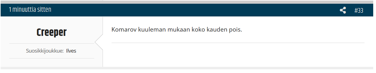 Kuulostaa omaan korvaan täysin käsittämättömältä että herran vuonna 2023 joku Leo Komarovin hankinta saa jalan nousemaan polkimelta vielä täysin alisuoritettujen harkkapelien jälkeen. Vaikka Ilvesfoorumi on Ilvesfoorumi niin en kyllä halua uskoa, että täällä jonkun Komarovin hankinnan vuoksi alettaisiin keulimaan. Varmasti tarkasteltaisiin kriittisien lasien takaa. Ehkä, jos sellanen tasoa Manninen tai Ruotsalainen tulisi niin asia voisi olla eri.