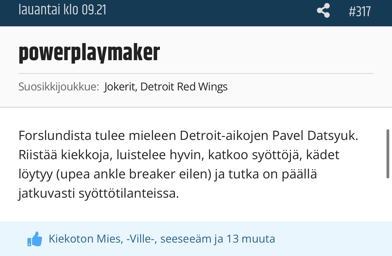 Tähän lisään vielä sen, että kävi juuri se mitä odotettiin.Samaa itsekin pohdin. Eiköhän poika pelaa itselleen rahakkaan sopimuksen Jokereihin, ja jo tästä hetkestä katsottuna vuoden päästä löytää itsensä pelaamasta muualla.