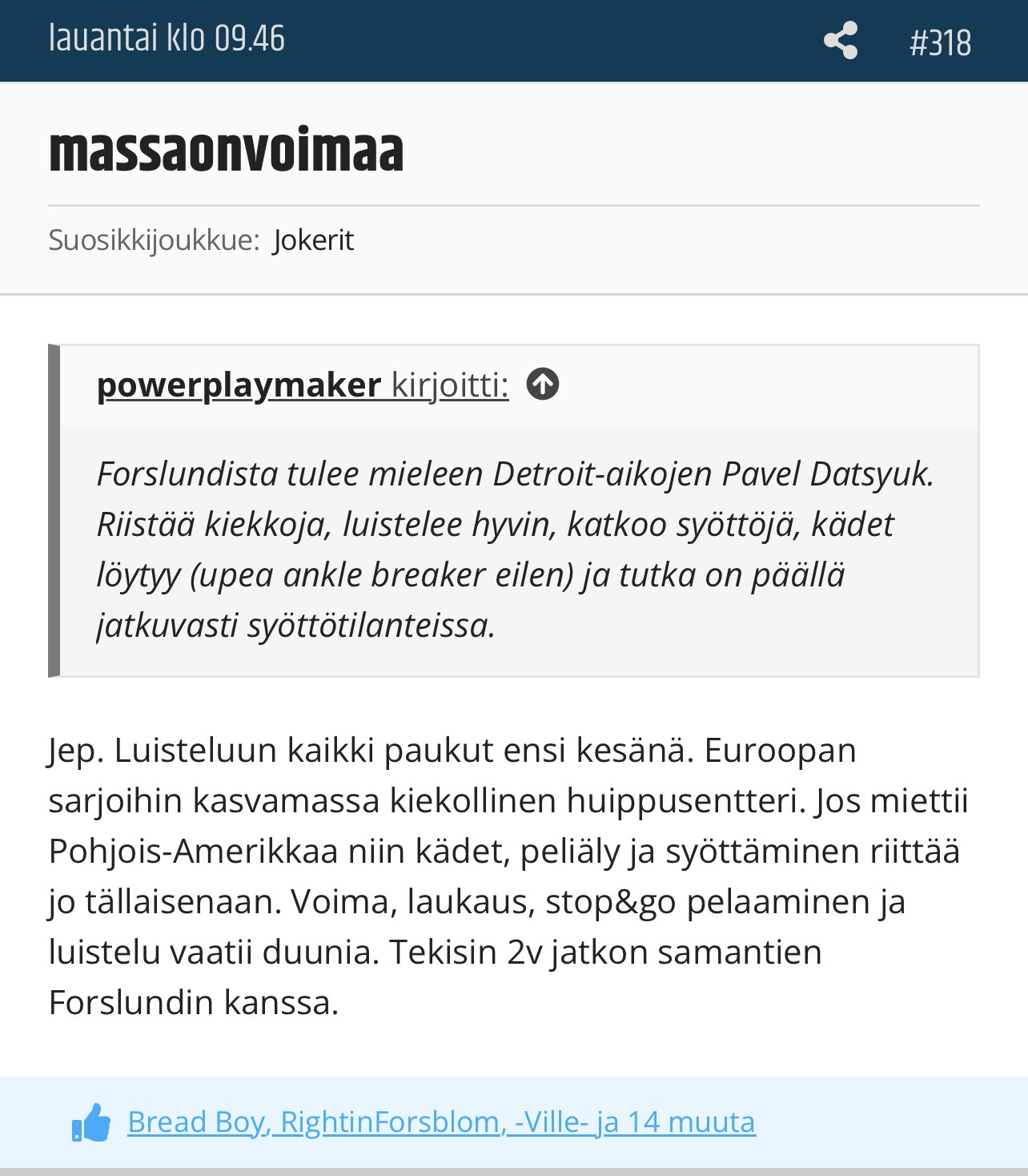 Jotain 24veenä Mestistä pelaavaa Forslundia vertaillaan Datsyukiin ja höristään kuinka on ”kasvamassa Euroopan sarjoihin huippusentteri”.