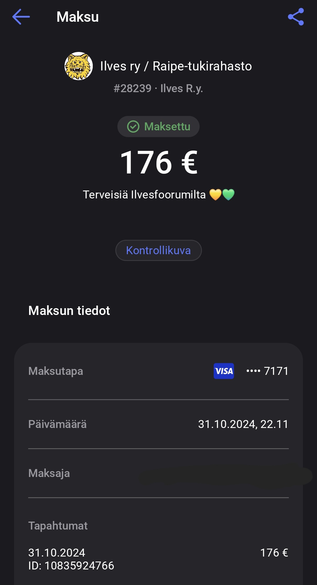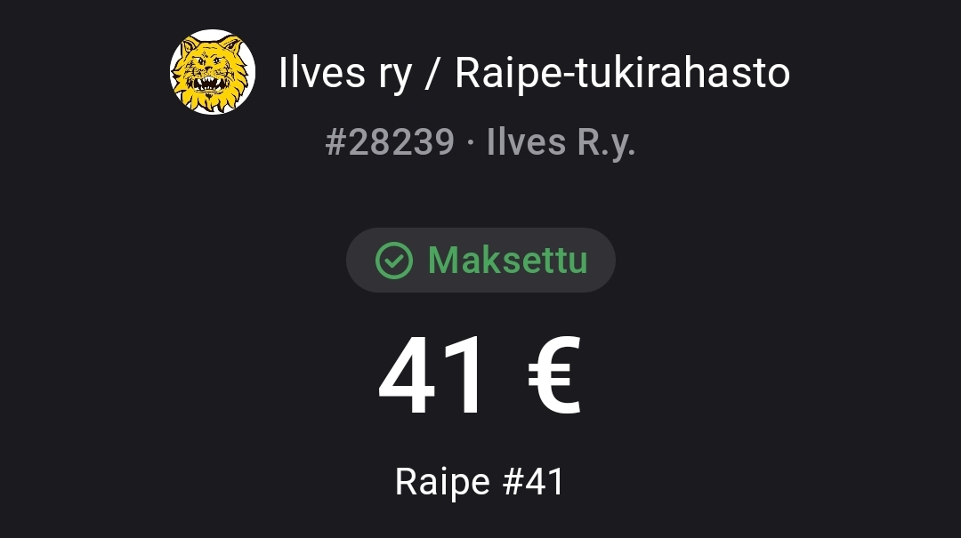 Hiljasta on. Heitän tohon oman huudon päälle vielä vitosen jokaisesta Ilveksen ja Saipan maalista, jonka tekevät ennen huutokaupan umpeutumista.