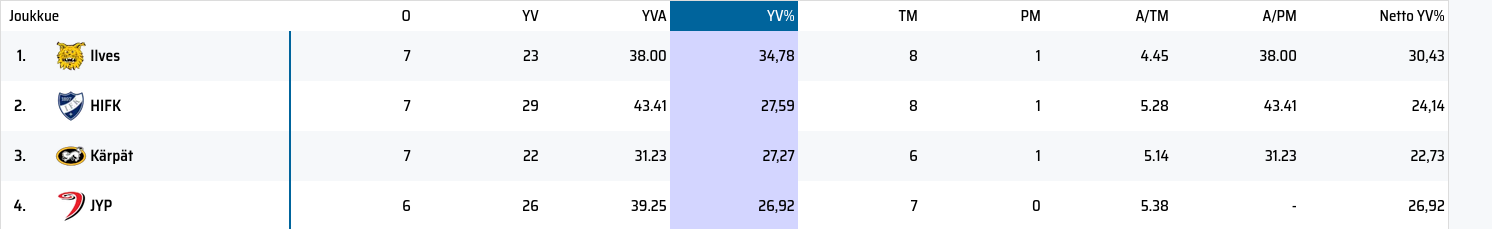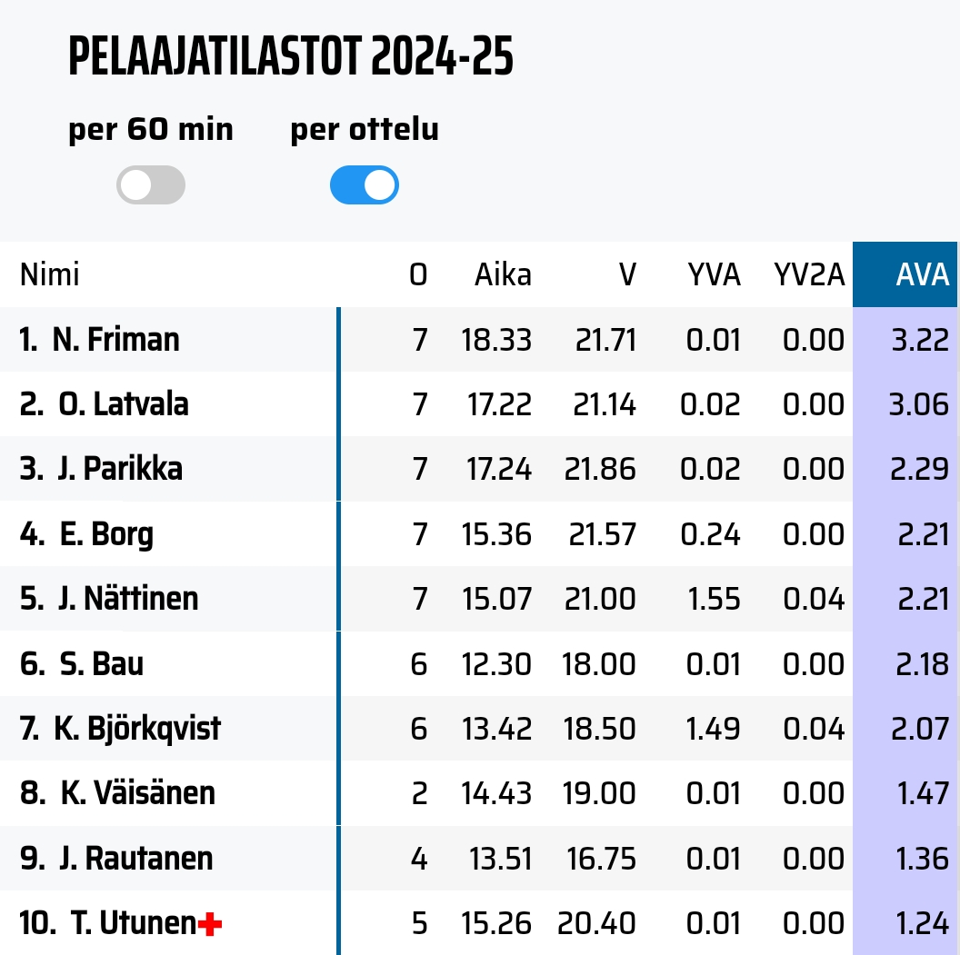 Pointtisi on ihan totta, eli ei Ilveksen varmasti ole tarkoitus pelata kolmella puolustajalla AV:ta vaan kyse on pienellä otannalla enemmänkin noista tekijöistä mitä huomioitkin. Se mikä kuitenkin tässä näkyy on, että Friman ja Latvala aloittavat lähtökohtaisesti aina alivoiman ja pelaavat siitä karkeasti ensimmäisen vaihtokierron. Jos näistä toinen on jäähyllä, toinen aloittaja on Parikka. Sitten kun Friman ja Latvala tulevat vaihtoon, heidän tilalle tulee aina Parikka ja kokoonpanosta riippuen Utunen (ykkösprioriteetti), Rautanen (kakkosprioriteetti) ja tarvittaessa sitten akselia Pelli, Johansson, Gazda. Jälkimmäiset toki lähtökohtaisesti pelaavat alivoimaa vain jos joku edellä mainituista istuu boksissa. Eli ehkä oikeampi listausta olisi Friman-Latvala, Parikka-Utunen/Rautanen, mutta näistä kuitenkin Friman/Latvala/Parikka -kolmikko aina muodostaa sen aloitusparin.Utusen av-aikaa "vääristää" (mikä on aika normaalia pienellä otannalla) pari asiaa: