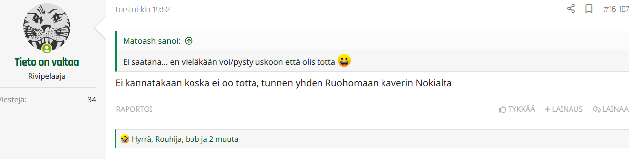 Tarkennetaan vielä, etten tarkoita leveyshankinalla mitään kaveria joka nyt jotenkin roikkuu kokoonpanon tuntumassa, vaan kyllä jokaisen joka tähän kokoonpanoon otetaan pitää siihen myös jotain tuoda. Jos vertaillaan naapuriin, ja miksi emme vertailisi, emme me enää ole mitään "10. sija on meidän mestaruus" - porukkaa, niin siellä oli varaa jättää Virta ja Kuusela kokoonpanon ulkopuolellekin ratkaisupeleistä. Sen verran hyviä pelimiehiä, että monessa porukassa olisivat kärkiketjuissa, naapurissa eivät vaan enää mahtuneet mukaan. Tuota luokkaa sen kokoonpanon pitää olla, jos mielii olla paras.