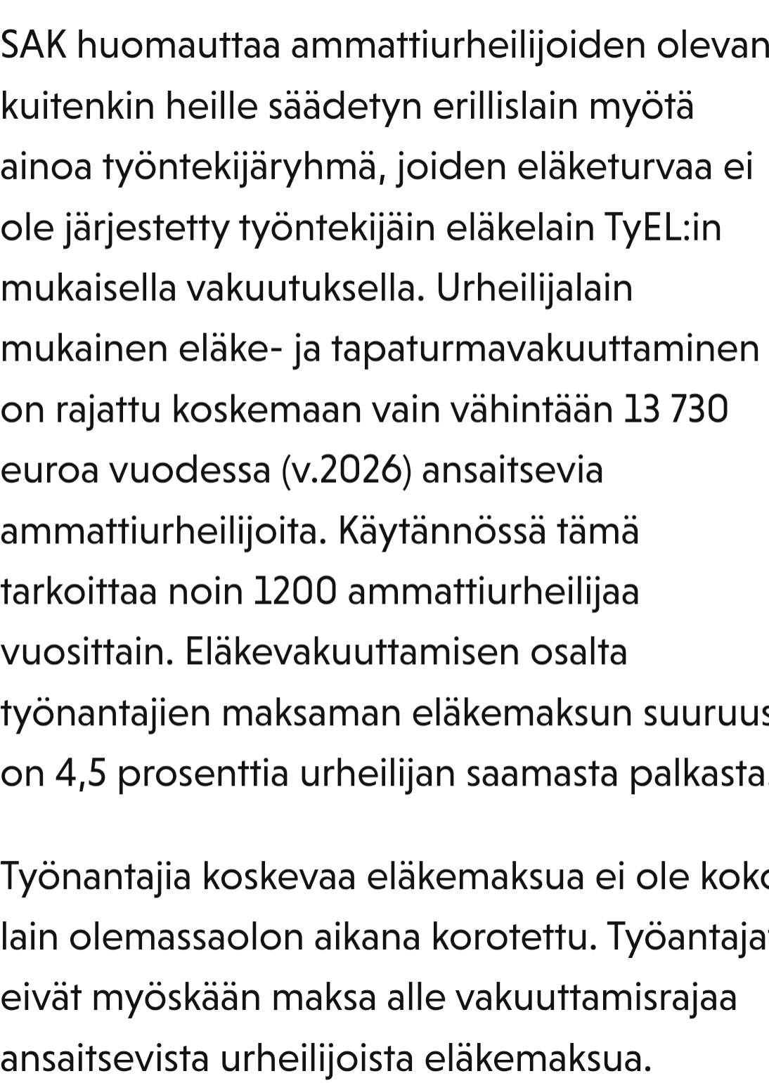 Tuo eläkemaksu on vain 4,5 % työnantajalla. Urheilijahan sitten itse rahastoi sen korkeintaan puolet tai mikä se katto olikaan, jota enempää ei saanut, vaikka palkka antaisi mahdollisuuden.