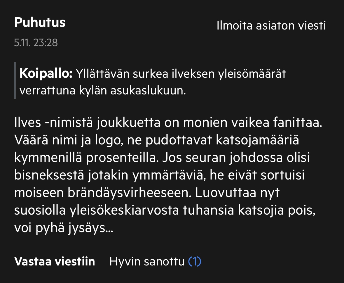 Jep. Sitä uudelleenbrändäystä on koitettu jo ja eipä se nyt niin suurta suosiota saavuttanut :D Ilvekseen ainakin puolilla pirkanmaalaisista on tunnesiteitä jo lapsuudesta, Tamuun ei ollut muodostunut sitä kovinkaan monille ennen tätä uusinta tekelettään ja nyt taas on ne puolet pirkanmaalaisista, jotka pitävät sitä vastenmielisenä.