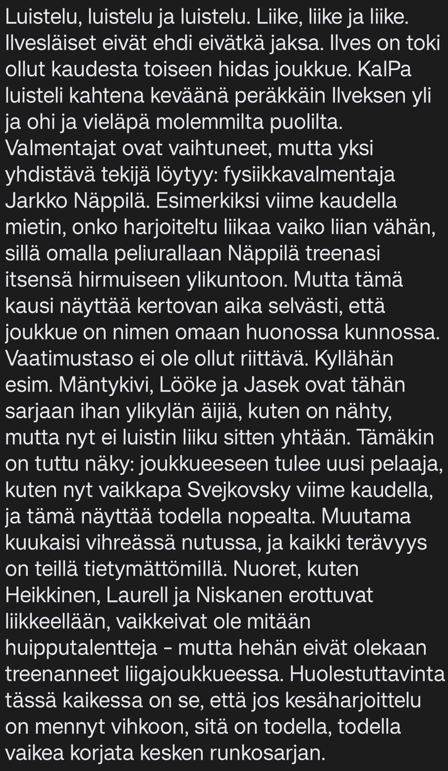 Ihan hyvä kirjoitus joltakulta somen puolella. Hieman arveluttaa, jos tuo väite Näppilän ylikunnosta omalla pelaajaurallaan pitää paikkansa, että onko ottanut opikseen siitä vai ei?