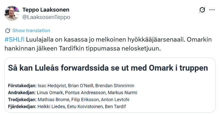 Ihan asiallisia Suomipoikiakin näyttää löytyvän alaketjujen duunariosastolta, kuten tämä Tapparasta tuttu aivan Liiga-tason kaveri Levtchi kolmosen laidasta. Nelosketju on toki suhteellisen nimetön, mutta arvaan, että olisivat Liigaankin asiallista työmiesosastoa nämä Liedes, Koivistoinen ja Tardif. Markus Nurmi on muistaakseni kohtalaisen lupaava poika ja saakin tuolla vastuuta jopa kakkosketjutasolla jonkun Linus Omarkin laituriparina.