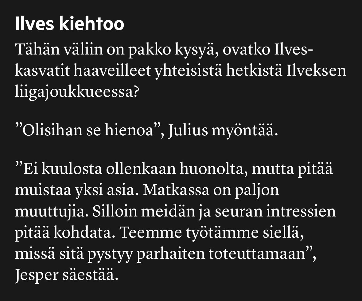 Hyväkäytöksisen nuoren miehen tapa ilmaista kohteliaasti, että näillä näkymin Ilves ei tule pyytämäämme hintaa maksamaan.