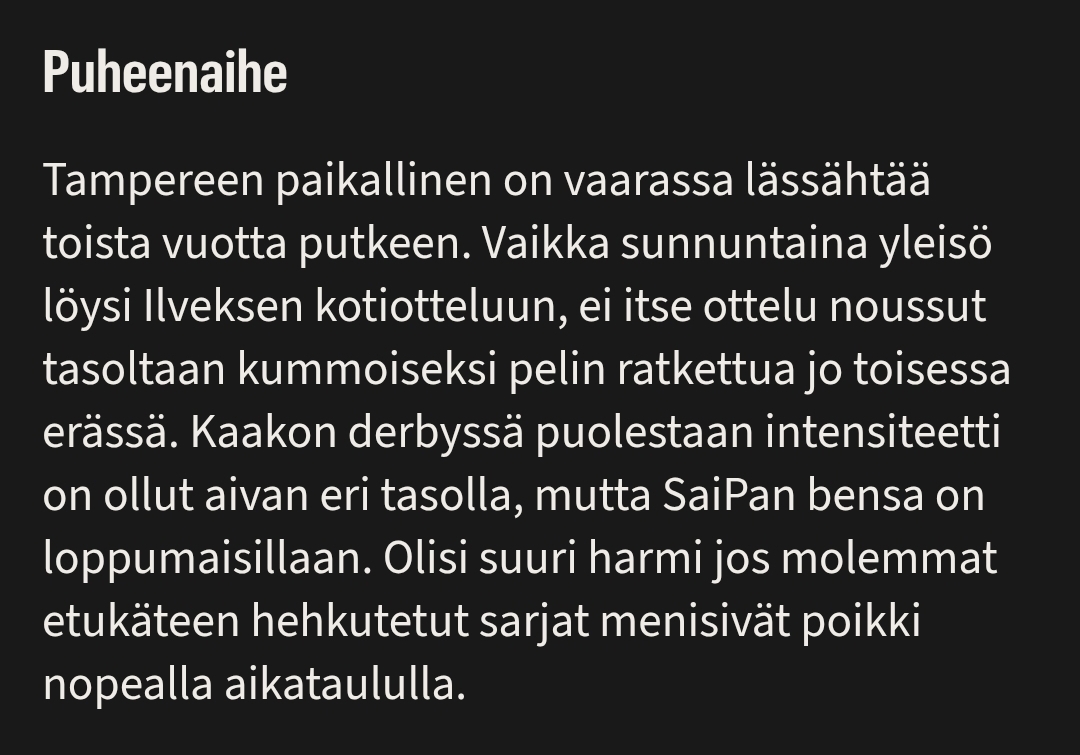 Kyllä mä ymmärrän, että Ilves oli eilen aivan erityisen hyvä, ja kuten oon jo kirjoittanut, niin oli ehkä koko kauden paras esitys kaikki joukkueet huomioiden. Pointti oli se, että Ilves teki Tapparasta aivan sysipaskan, ja kun Tappara ei ensimmäistä kymppiä lukuun ottamatta saanut kirjaimellisesti mitään aikaan, niin en myöskään löydä mitään konkretiaa väittää, että Tappara olisi ollut jossain pelissä vielä huonompi kuin eilen. Mutta sinänsä toki ihan sama, ja olisihan tuon voinut toimittaja väliinkin jättää, kun ei myöskään mitään todisteita, että oli kauden huonointa Tapparaa, mutta ainakin se oli sitä suhteessa vastustajaan ja toimittaja kyllä teki selväksi mielipiteensä Ilveksen tasosta.