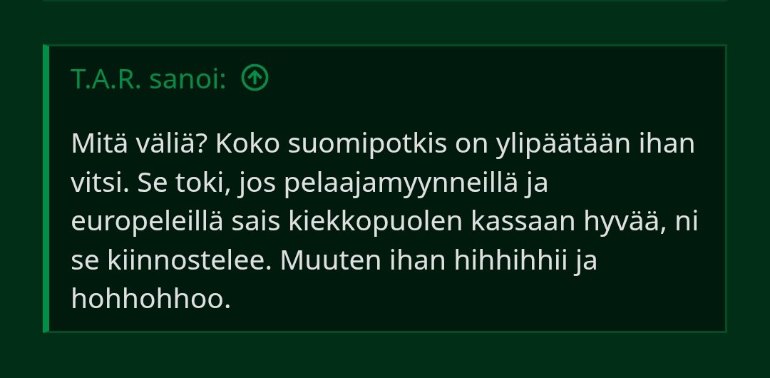 Harmittaa ja ei harmita. Ei tällä pelillä mestaruutta ansaita, mutta harmittaa tietysti että parempaan ei pystytä. Ei tämä nyt ihan saletti vielä ole, mutta lähes kyllä. Kun nyt edes europaikka saataisiin isomman katastrofin välttämiseksi. Tuntuu painajaiselta ajatuskin ensi kesästä ilman europelejä...