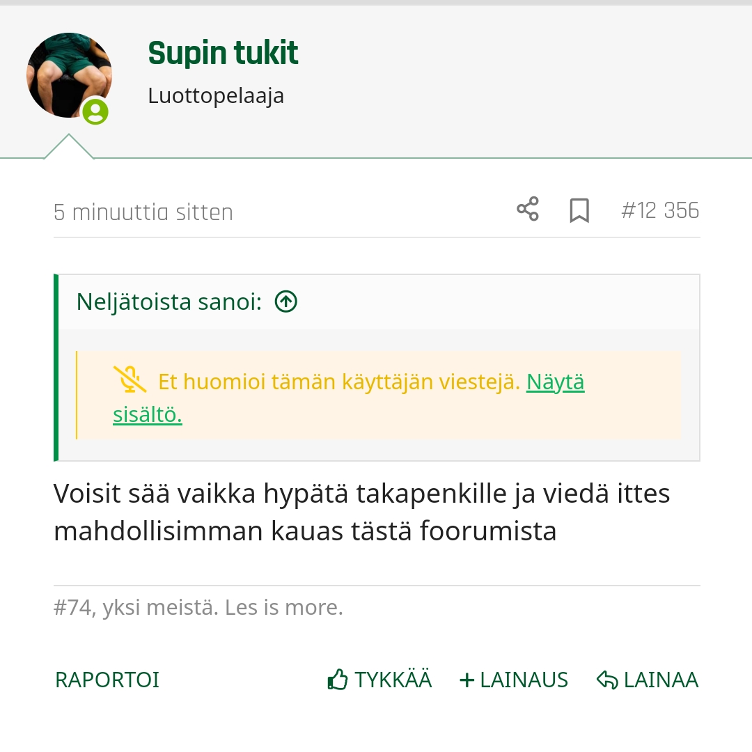 Taidan ottaa korvan taakse. Koskaan ennen en ole ketään hiljentänyt, kun näiden trollien suoltamaa paskaa on välillä ihan hauskakin lukea, mutta tämän kaverin sisältö on kyllä todella, todella raskasta luettavaa.