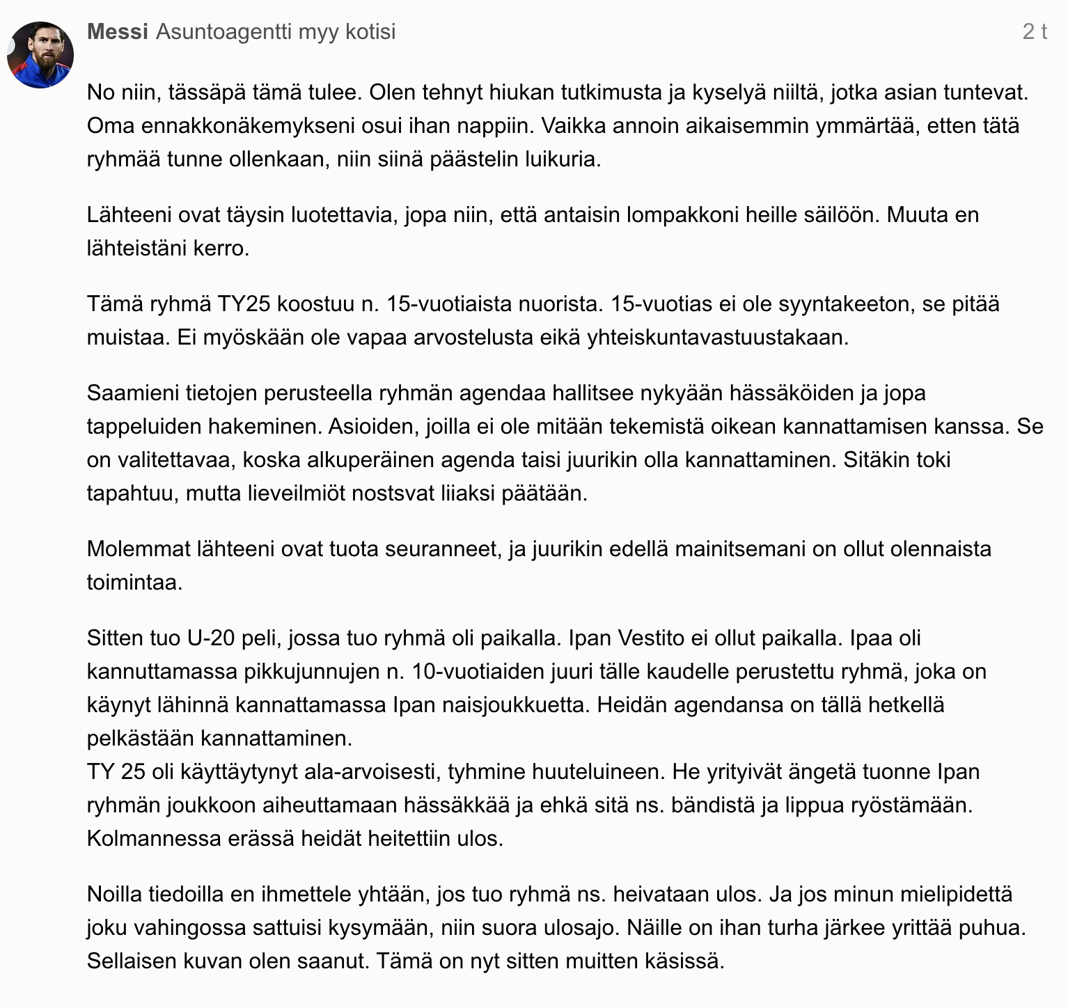 Vaikuttaa ihan tervejärkiseltä kaverilta tuo Messi, vaikka mouhofoorumilla kirjotteleekin.