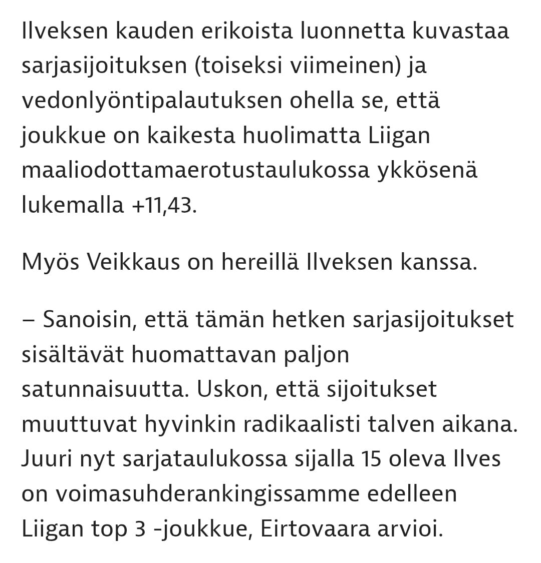 Ajattelen samoin, että top 4 Ilveksen pitikin päästä. Mutta, ei se automaattisesti tapahdu. Kärpät hyvä esimerkki, että paperilla ei pääse edes top 12. Pitää myös suorittaa. Ilves suoritti ja teki sen ensimmäisen kolmanneksen jälkeen Liigan parhaiten. Toki ensimmäinen kolmannes on syynä siihen, että ollaan neljänsiä eikä runkosarjan voittajia.