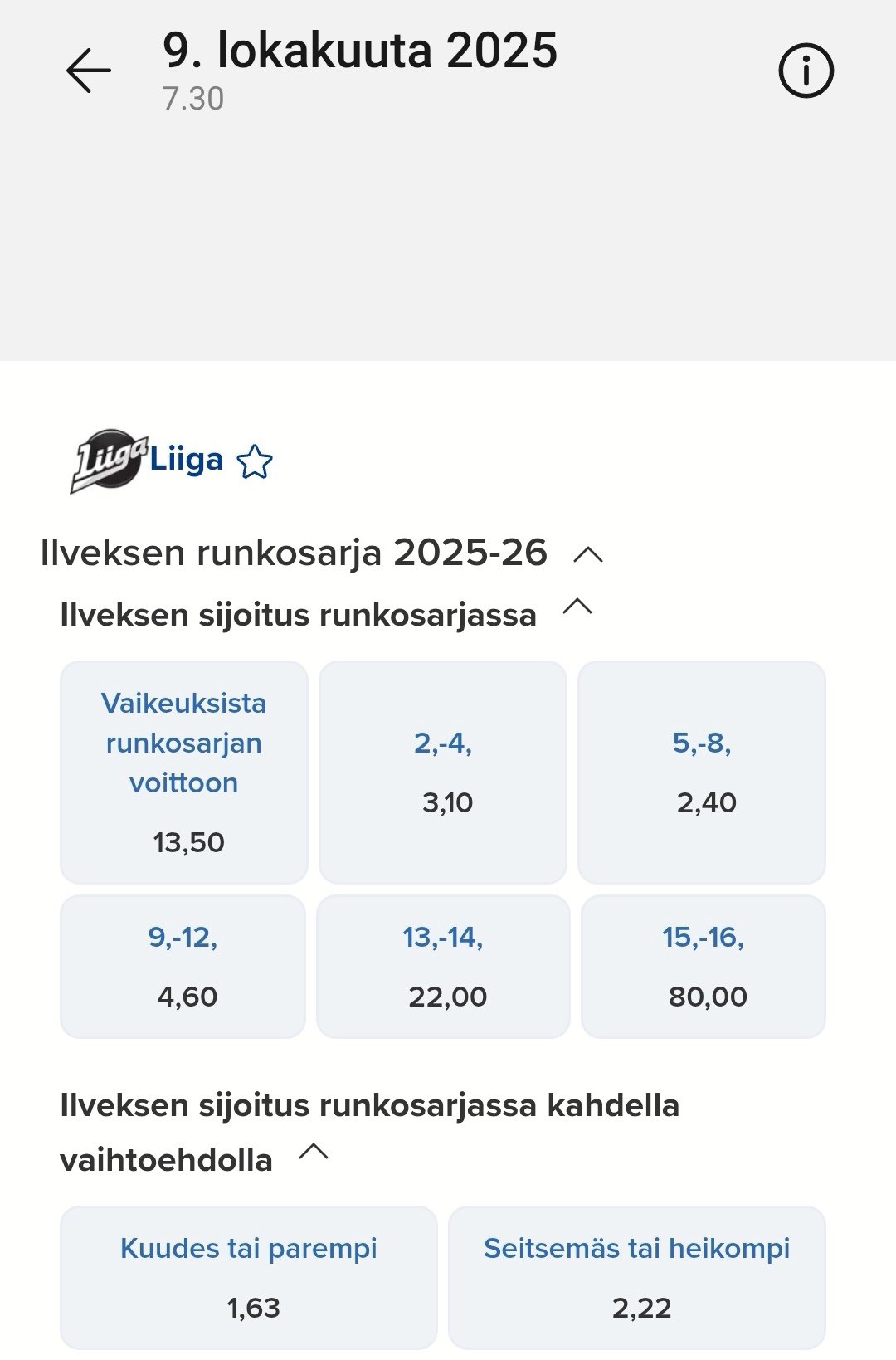 Veikkauksen kertoimien mukaan todennäköisyydet Ilveksen puolivälierävastustajalle ennen 1. playoff-kierroksen alkua ovat seuraavat: