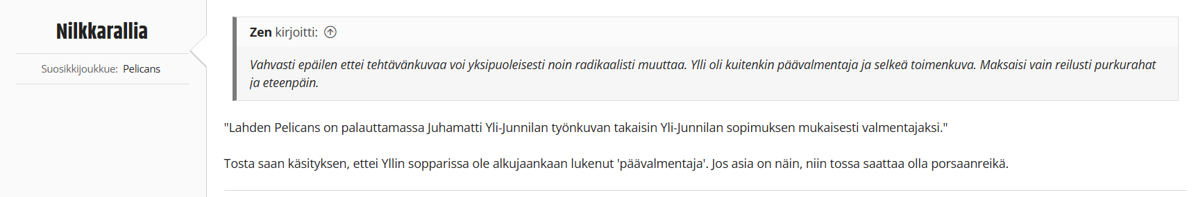 - Pelicans ei halua vapauttaa Yli-Junnilaa työvelvoitteesta, koska silloin joutuisi maksamaan tämän ja ensi kauden palkkaa.