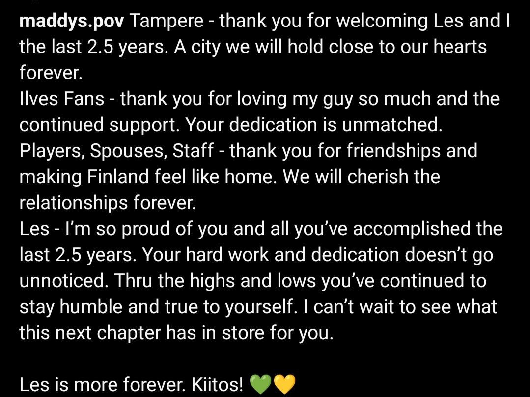 Vaikutti muistelevan lämmöllä Suomea ja haastattelijakin nosti erikseen esiin, että eivät ole koskaan saaneet yhdenkään uuden pelaajan entisen seuran faneilta niin paljoa kehotuksia "pitää hyvää huolta" pelurista :D