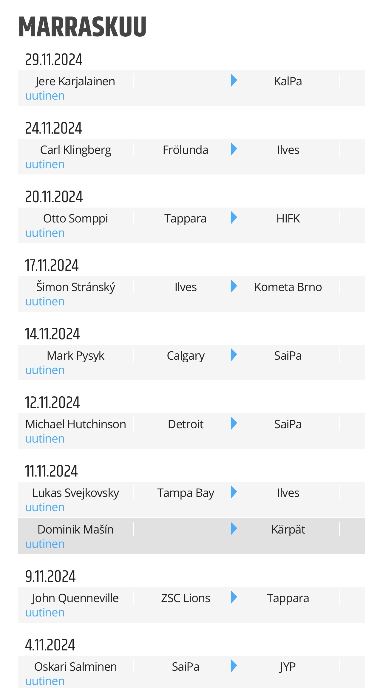 Tänään tosiaan Kärppiin julkaistiin Marcus Björk ja voisi nostaa alkukaudesta meille tulleen Simmen tähän myös. Tuossa tosiaan näkyy vain marraskuun siirrot.