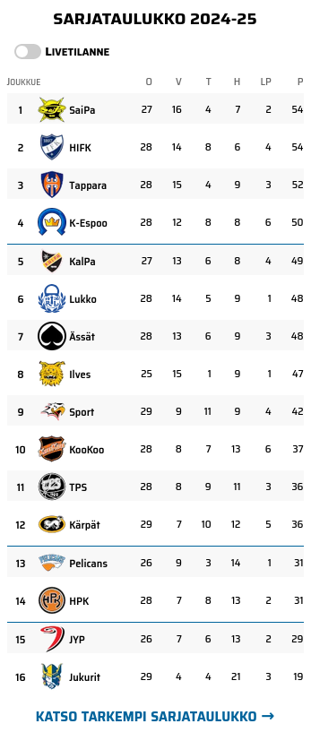 Runkosarjan seuraaminen on myös haastavaa, kun esimerkiksi Ilves voittamalla noi 3 rästipeliä suorilla 3 pisteen voitoilla vs IFK niin olitaisiin sarjakärjessä. Toki ne rästipelit tulee hoitaa myös.Tässä kun kauden puoliväli alkaa lähestymään niin Liigan top4 näyttää juurikin siltä mitä tääläkin monet ennen kauden alkua ennusti.