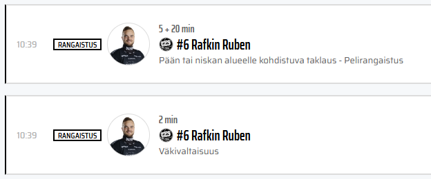 Millä tuosta saatiin Rafkinille vain 2 minuuttia kun heitti hanskat ja tappeli? Tuulolalle 2+2 kun aloitti ja piti hanskat. Päin mäntyä meni Rafkinin jäähy.