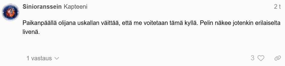 Otto voi nyt kutsua sitten toimittajan paikalle, että ei ole turvallinen tila tuo Areena enää, kun vastustajan valmentajakin itkee onnesta.