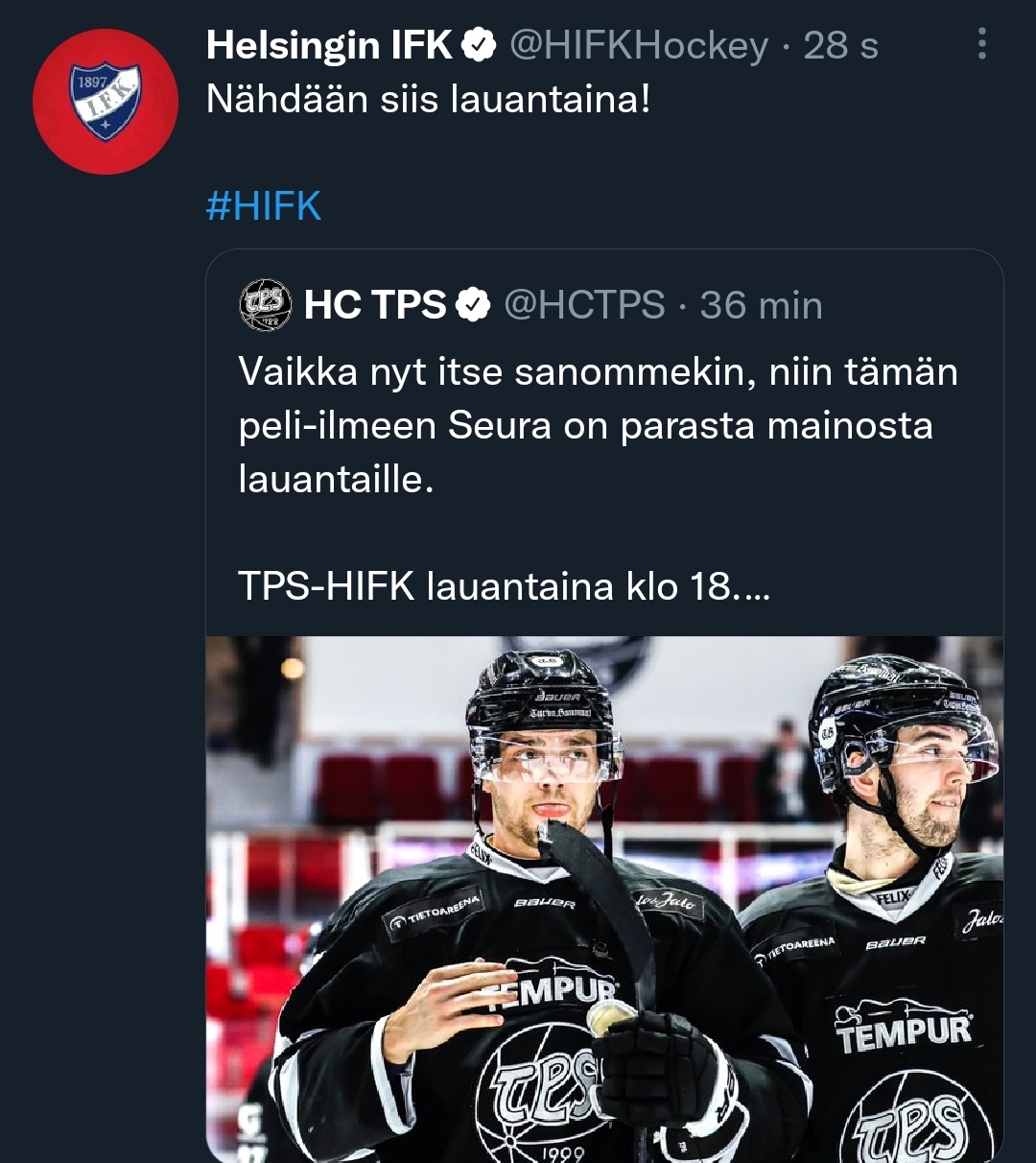 HIFKin twitteristiltä hieno reagointi Tepsin (sittemmin jo poistettuun) twiittiin: