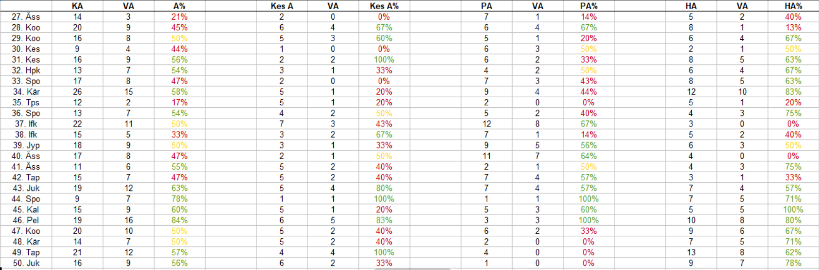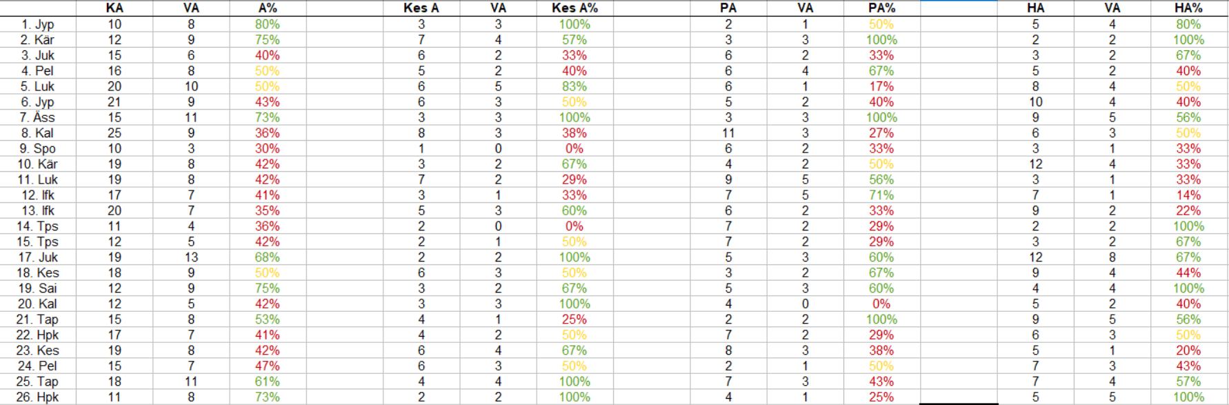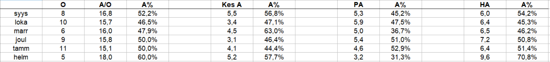 Kovaa suorittamista myös aloitusympyrässä, kun huomioi vastassa olleen suurelta osin vastustajan parhaita aloittajia.