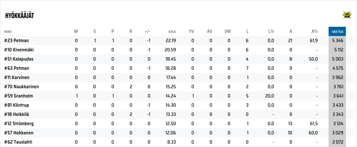Luistelumatkoista ei kannata vetää minkäänlaista analyysiä. Luistelumetrejä syntyy niin monista eri syistä ja usein se kertoo ihan muusta kuin siitä, että olisi oltu ns. pelin päällä. Viime kaudella eniten luisteli TPS, joka sijoittui runkosarjassa yhdeksänneksi. Viime kauden Ville Hämäläisen vitsi-SaiPa luisteli kolmanneksi eniten sarjassa. TOP3 vähiten luistelleista löytyi Ilves ja tilaston viimeiseltä sijalta finaalissa pelannut Pelicans.