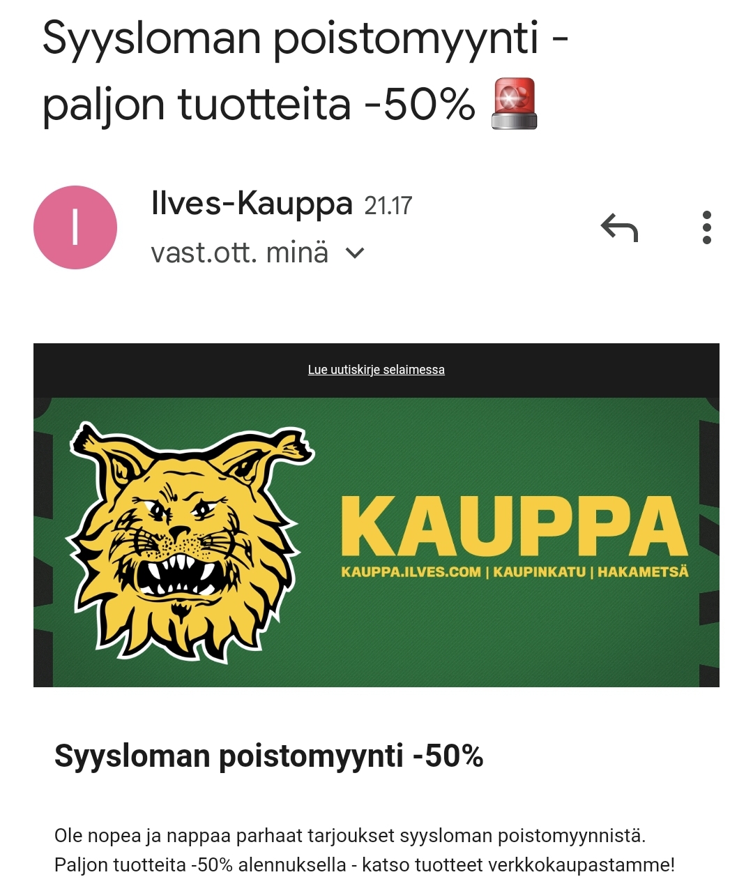 Itsekin tuli hyödynnettyä noi alet. Harmillisesti vaan yksi paita tippui vahvistetusta (maksetusta) tilauksesta pois saldovirheen vuoksi.