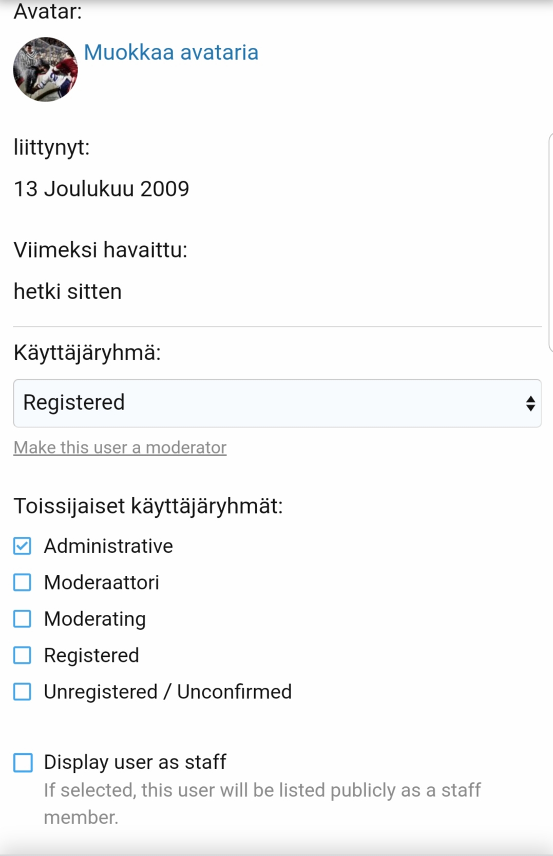 Kieltämättä hieman epäselvää mikä on kenenkin rooli. Onko moderaattori aina myös ylläpitäjä? Eikös tuo Administrator ole koko systeemin pääkäyttäjäoikeudet omaava henkilö?Tämä Heke voisi muokata tuon statuksensa kun lukee joku administration. Mitä se edes tarkoittaa, onko hän joku ylipäällikkö? Ylläpitäjä siihen jos kerran sellainen on tai muuten suu suppuun.