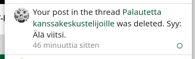 Ymmärrän miksi viesti poistettiin, mutta ehkä syyhyn voisi inasen lisätä kontekstia. Piti hetki pohdiskella että mitä sitä tulikaan kirjotettua kun ei syykään mitään kertonut![]()