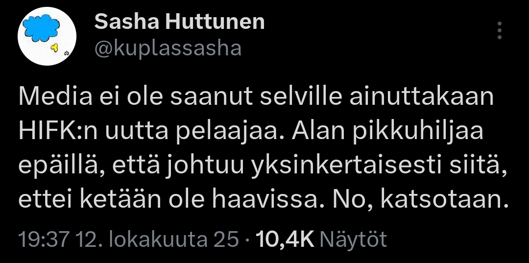 Juu ei tuo ihan sitä ole mitä IFK kaipaisi. Mutta muuten ihan mielenkiintoinen.Ei käy kateeksi kyllä HIFK faneja kun siellä Pesonen touhuaa![]()