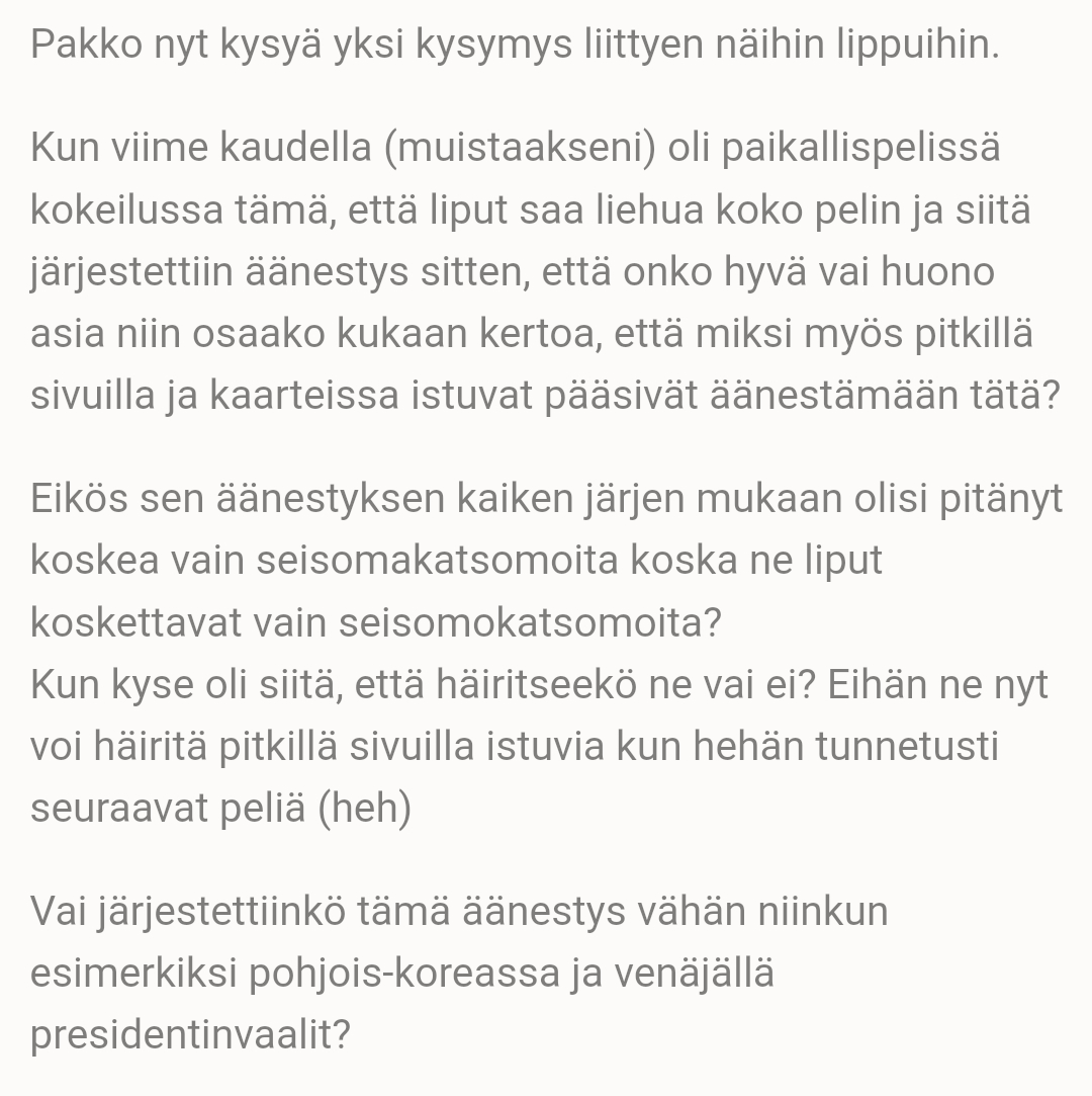 Koitin kysyä tälläistä asiaa tuolla porkkanamaalla Sinioranssien ketjussa kun siellä keskustellaan lipuista.