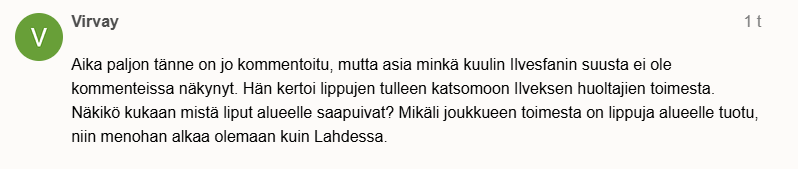 Miten tämä mitään negatiivista julkisuutta Ilvekselle tuo? tapparan isännöimä peli ja Osasto ei ole mitenkään sidoksissa Ilvekseen.Ymmärrän hyvin täällä esitetyt kannat liittyen järkkäreiden toimintaan ja ylireagointiin ym. Samoin sen, ettei se lippujen heiluttaminen mikään rikos ole.