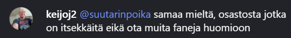 Tämä Keijo on kyllä ihme kaveri myös. Facebookin Liiga päivityksissä yksi kovimmista Ipalaisista ja Mouhon paskojista, mutta sitten joka käänteessä aina oksentaa Osaston päälle ja manaa näiden touhuja. Tämäkö on sitä yhteisöllisyyttä mitä olemme vaalineet, että käännytään omia vastaan?