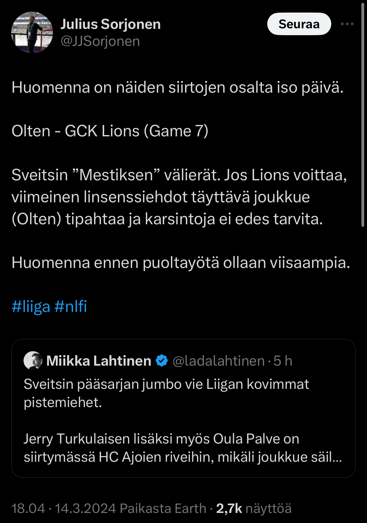 Joo toki Niku ja Clendening tulivat kesken kauden. Ensi kauteen lähdetään varmasti kovalla rosterilla, jota sitten vielä vahvistetaan kauden aikana.Kieltämättä toimistossa melkoinen homma korvailla Palve, Ikonen, Niku, Clendening, Masin, Nyman jne. Helkkari kun noista edes 1-2 saataisiin pysyyn..