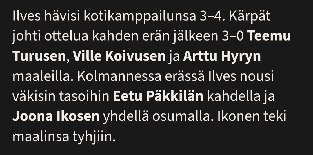 40 minuuttia oli kyllä tylyä Kärppien hallintaa ja meillä ei ollu mitään palaa siinä ja liian isoja yksilövirheitä tuli.