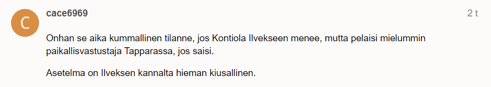 Täällä ollaan huolissaan sopiiko Konna (pistepörssin kärki) Ilveksen pelitapaan. Katsokaa kentälle. Ilveksellä ei ole mitään pelitapaa tällä hetkellä. Lisäyksenä vielä, että jos tuo on se kuuluisa pelitapa, niin Konnan ei pidäkään sopia siihen, koska kukaan muukaan ei sovi.