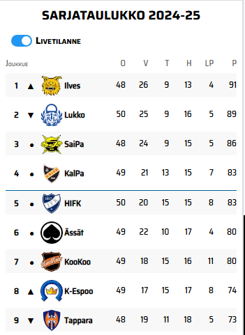 Tuon mukaan neljän joukossa yli 99% todennäköisyydelläKiakko xyz simulaation mukaan Ilveksen todennäköisyys olla runkosarjan ykkönen on yli 77% ja top2 sijan todennäköisyys 92%. Hyvältä tämä kyllä näyttää ja ilmeisesti myös pudotuspelipaikka on varmistettu samalla!