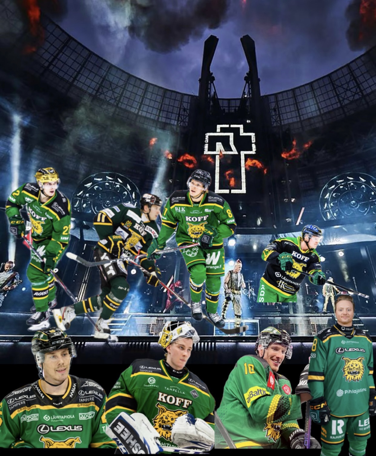 Jotenkin näin.Kesken kolmannen erän tuomari viheltää pilliin. Halli menee yhtäkkiä aivan pimeäksi ja yhtäkkiä savujen keskeltä keskiympyrässä nousee lava, jossa Till Lindemann yhtyeineen virittää liekkien ja pommien keskellä Deutschlandin ensisävelmiä.