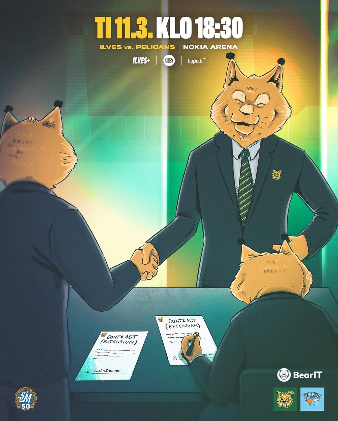 Sitten ei ole Supi.. hän viskaa kynän aina pöydälle, ei siirtele kädestä toiseen. Mese se sittenkin on.Kyllä, ja lisäksi oikeanpuoleinen Ilveshän on jo juuri nimmarinsa kirjoittanut, ehtinyt vaihtamaan kynän vasempaan käteensä ja valmistautuu nousemaan ylös myös kättelemään oikealla kädellään!