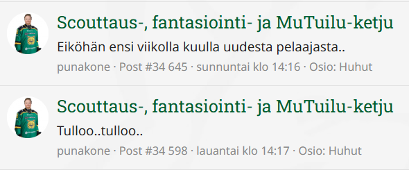 Sama ilmiö ollut joka kevät. Muutama nimimerkki tulee mieleen joille jokakeväiset tippumiset on olleet kauden paras päivä kun pääsee sanomaan että "mitäs mää sanoin, ei tuu riittään mestaruuteen". Ihan niin kuin tuossa "tietämisessä" jotain hienoa olisi.Vähän tuntuu nyt siltä, että täällä odotetaan enemmän sitä, että mitään huhua ei toteudu kuin että toteutuisi