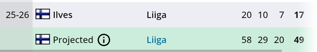 Joo tiedän kyllä. Pointti se, että harmittavasti tämä uran tähän hetkinen huippu osuu tällaiseen kauteen, kun muilla ei kulje.Simmehän tuli takaisin viime kaudelle. Tuolloin runkosarjassa: 39, 9+13=22 ja playoffeissa: 11, 2+4=6.