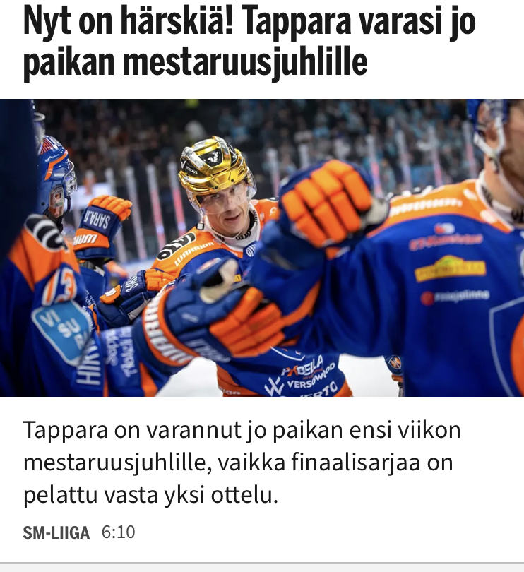 Tällä kaudella Tappara voittaa ihan kaiken ja jokseenkin näytöstyyliin, ensi kaudelle uusiutuu lähes kaikki. Jos ne ei ens kaudella ole voittamatta, niin koska sitten?Ensi kaudesta tulee niin mielenkiintoinen, Tappara tulee olemaan tottakai kova, mutta onko se menestyminen tällaista samanlaista, ylivertaista traktorin jyräämistä?
