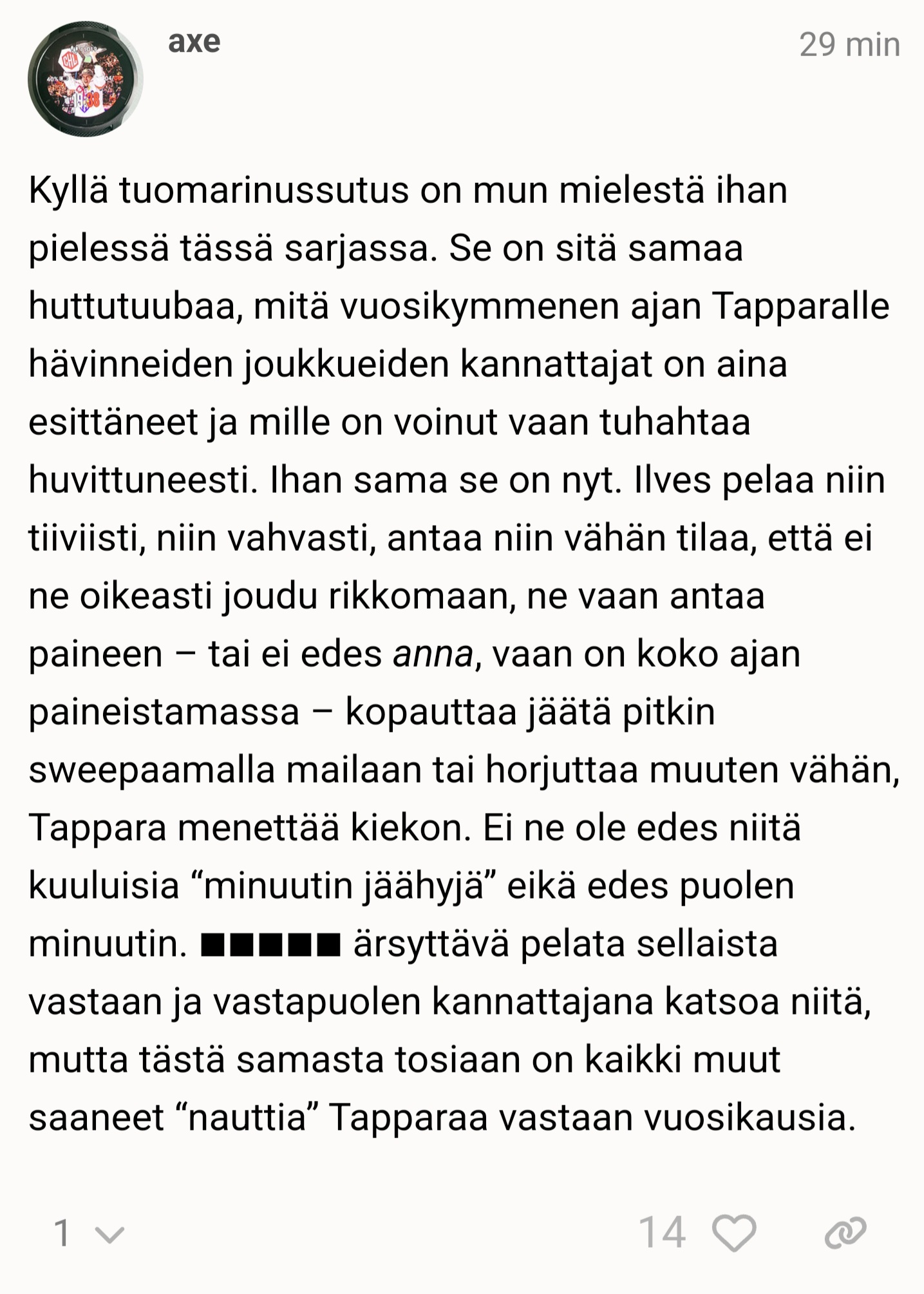 En kyllä yhtään tykkää kun Touru tuommosia kirjoittelee. Sarja on edelleen pahasti kesken ja jos joku tuolta voi itsensä kammeta niin Tappara. Lukee ne Tapparankin pelaajat noita tekstejä ja turha antaa niille sytykettä ilmoittamalla että tää sarja on jo ratkottu-