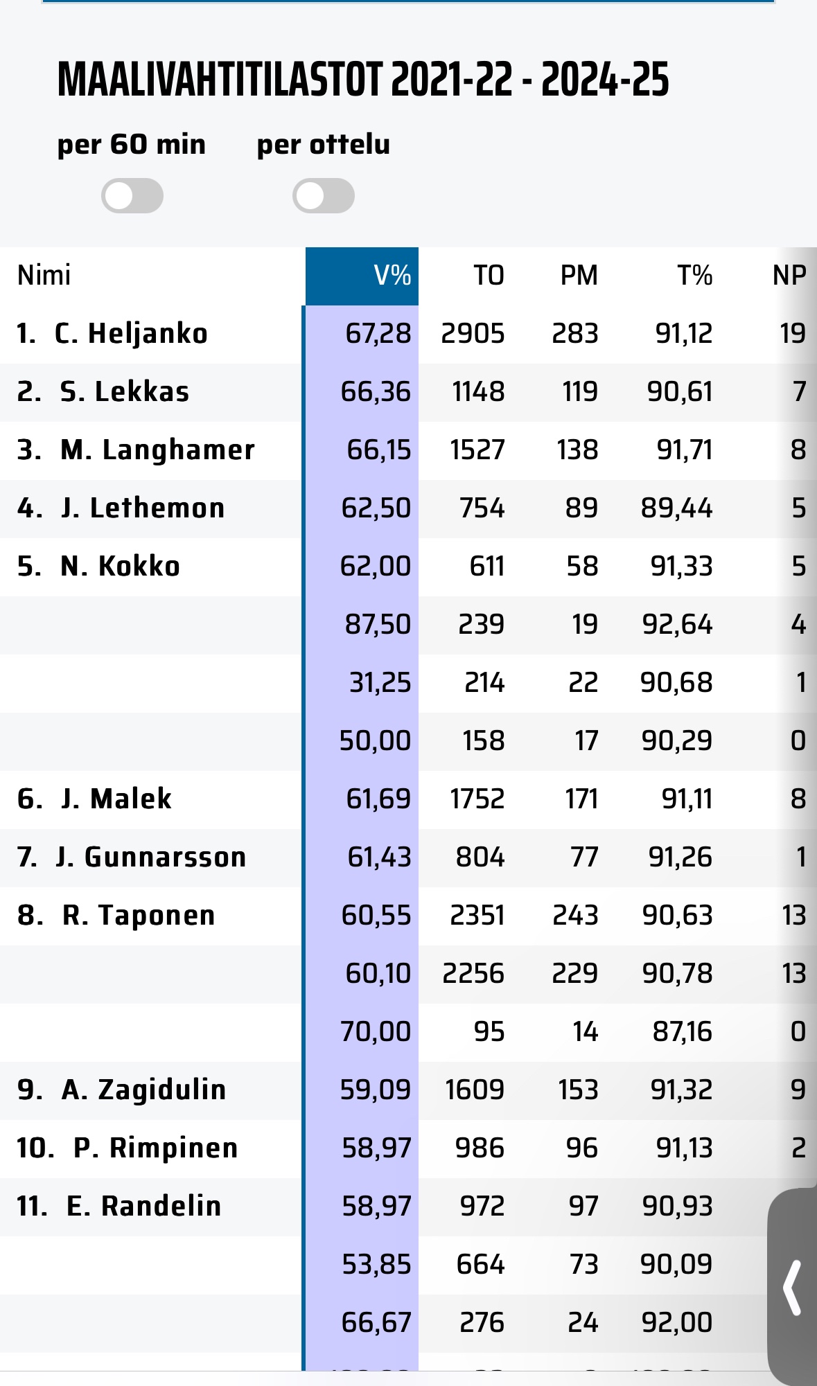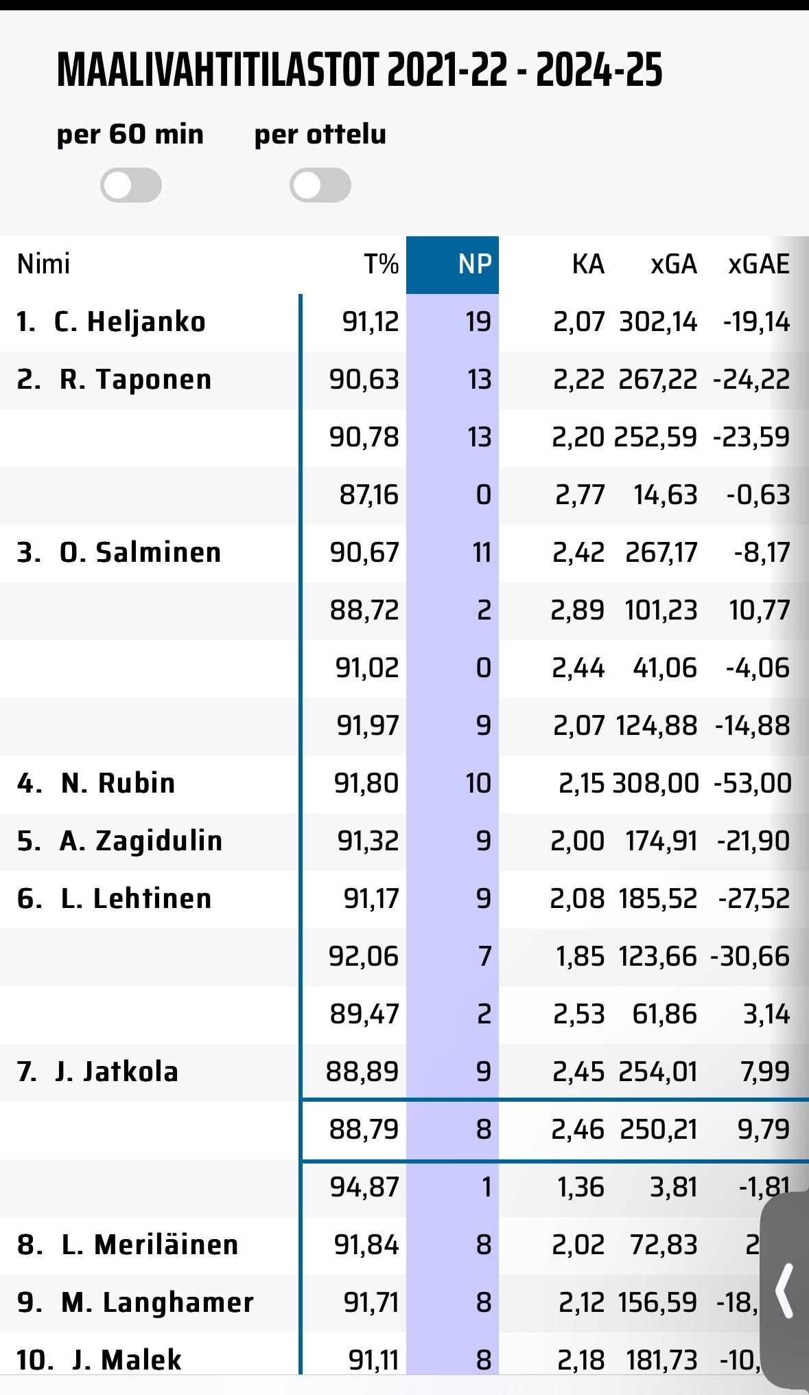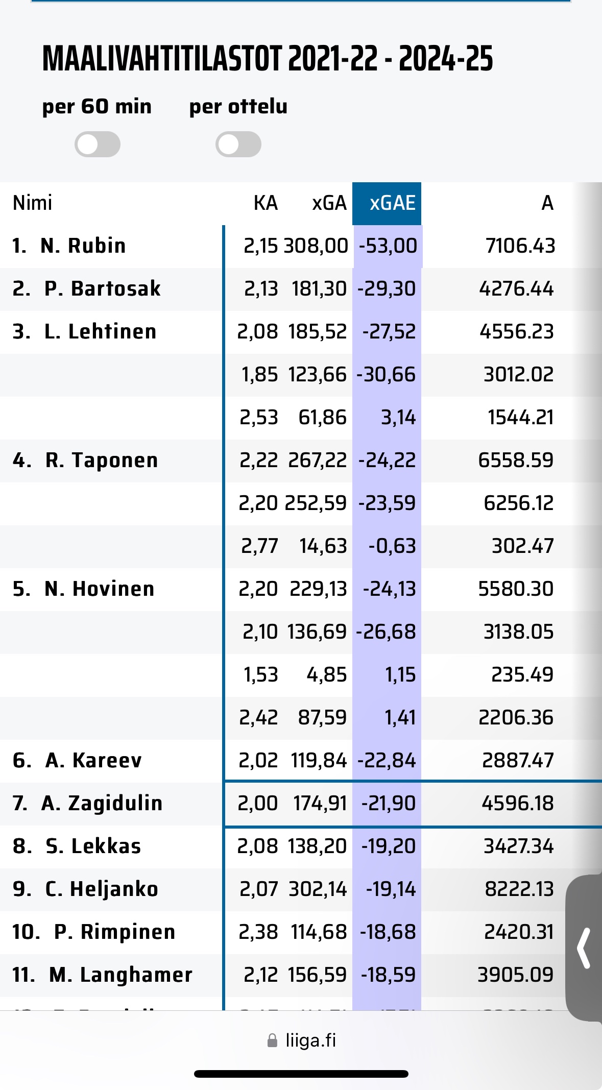Löytyy ihan helvetin monta. Noista @Blackhawk :n kuvista näkyy totuus. xGAE:kin todella kovalla tasolla. Jos ei kyseisestä tilastosta ymmärrä tai välitä, niin voipi vilkaista minkälaiset ukot siinä pärjää. Ei jätä paljon selittelyille sijaa. Yllättävän moni ilmeisesti mennyt Taposen kohdalla tähän miinaan, jossa HIFK:n jatkoajan palsta huusi miestä vastaan, kun ei sitten ollutkaan riittävä ykkösmolari sinne. Tilastoista näkee hyvin senkin, ettei Taponen ollut edes siinä roolissa lähellekään niin huono kuin mitä yleinen mielikuva sanoo, mutta missä vaiheessa tää nyt on muuttunut niin, että olis ollut Liigan huonoin tai huonompia? :D