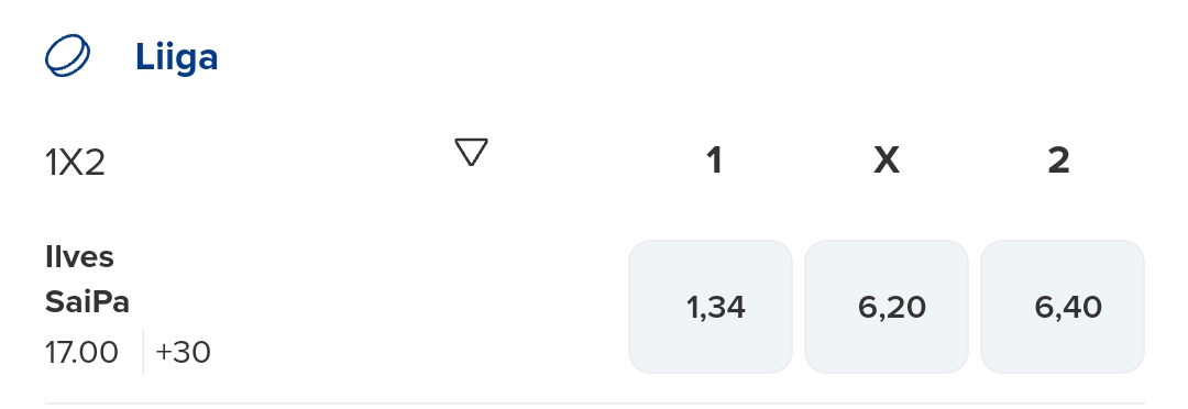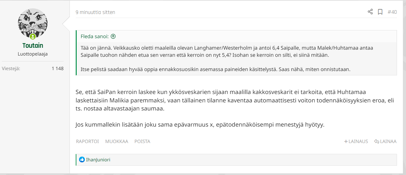 Ei tuossa tapahtunut muuta kuin tosiaan Ilveksen kakkosmaalivahti nosti Veikkauksen papereissa SaiPan todennäköisyyttä hieman: karkeasti 15% - > 18,5%