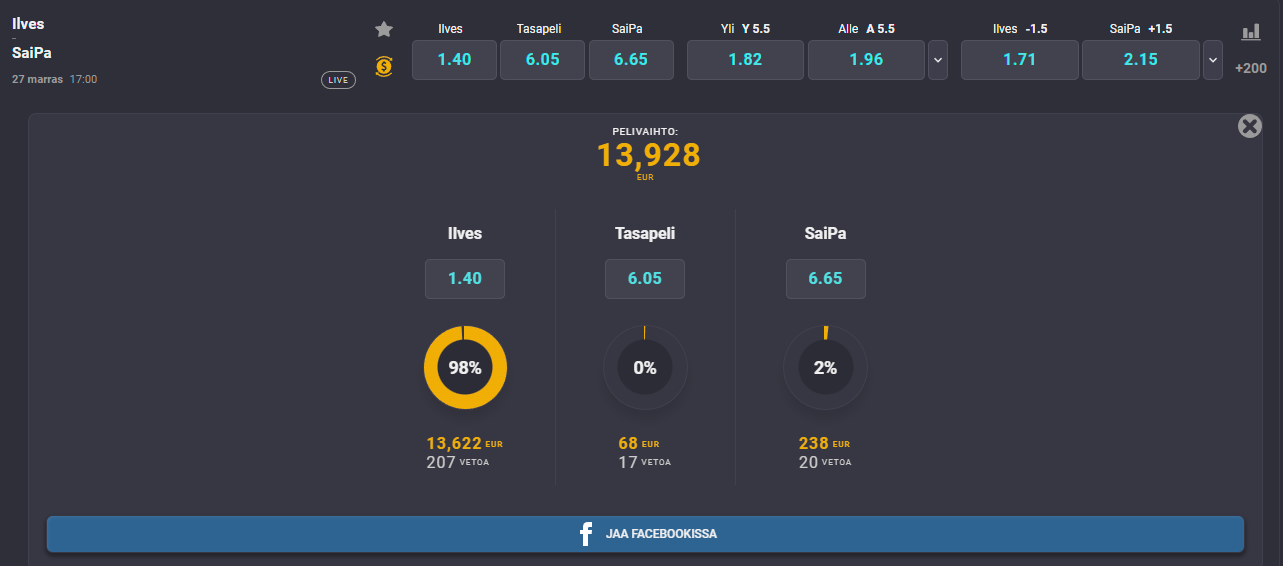 Kyllä Coolbetin jakauma silti kertoo asiasta jotain. Ei tuossa Veikkauksellakaan oo SaiPaa painettu niin, että kerroin laskenut sen takia. Coolbet on ihan kelpo saitti. Kyllä sieltä rahaa ehtii tehdä ennen kuin limitit paukkuu ihan naurettaviksi. Mutta joo, kuuluu niihin, jotka rajoittaa (lopulta).
