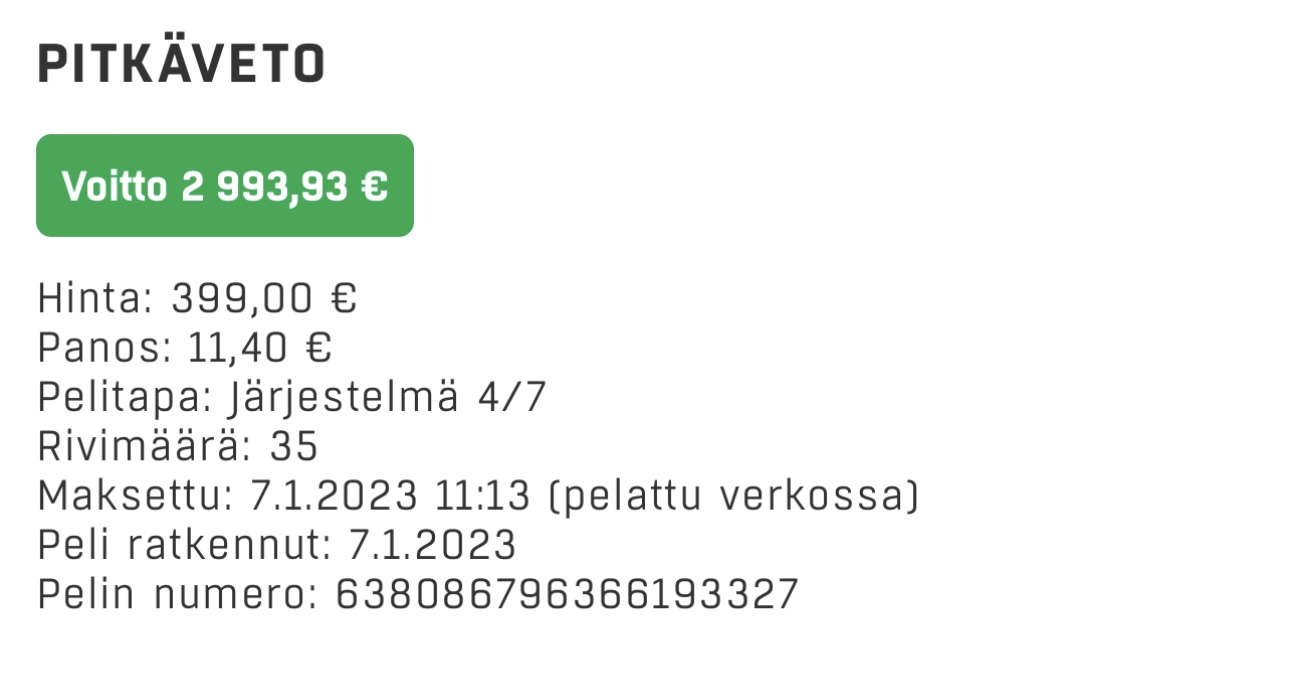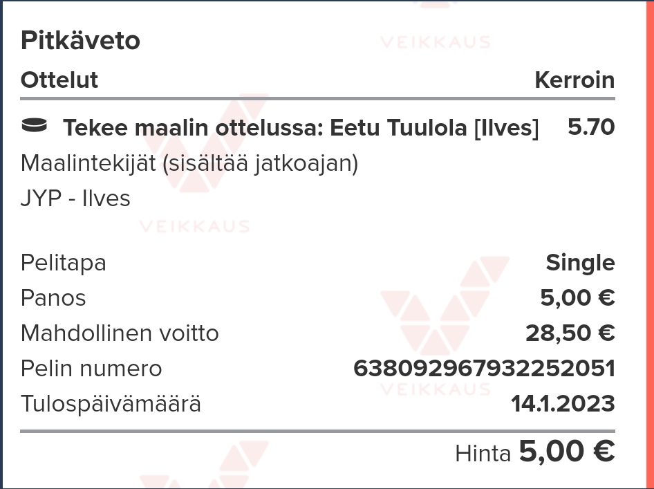 Pakko sitä on siis laittaa Veikkauksen monopoliin rahat Tuulolan ekaan, vikaan ja yli päänsä maaliin. Saa suorittaa Eetu.Uskon että en ole ainoa, voi olla että koko kohde sulkeutuu pian..