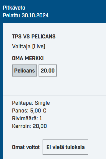 Itse laitoin hassuttelurekat sisään kolmella runkokohteella; HIFK, KalPa ja K-Espoo. Jukurit, JYP ja Kärpät ovat olleet enemmän tai vähemmän sekaisin ja olinkin yllättynyt vastustajille annetuille liki kahden kertoimille.@Rautakorven haamu sulla ollu aika hyvä vainu, mitäs tänää kannattaa veikkailla?